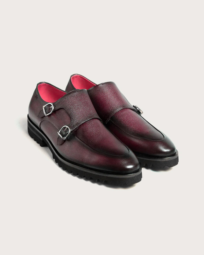 Los zapatos doble hebilla Claudio combinan la elegancia atemporal con la sofisticación moderna. Pintados a mano con la técnica de Patina italiana única en un cautivador tono vinotinto.