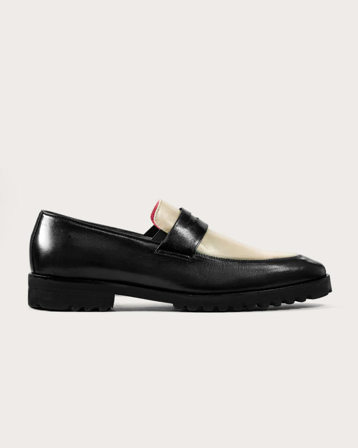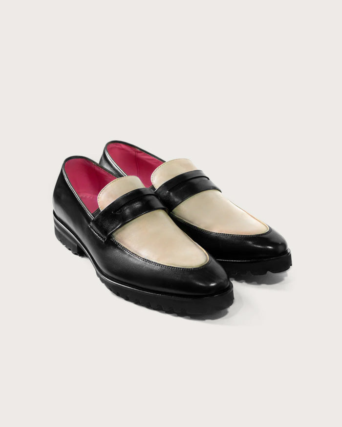 Mocasín de cuero para hombre, pintado a mano con la técnica de Patina italiana en un versátil tono negro y crema.