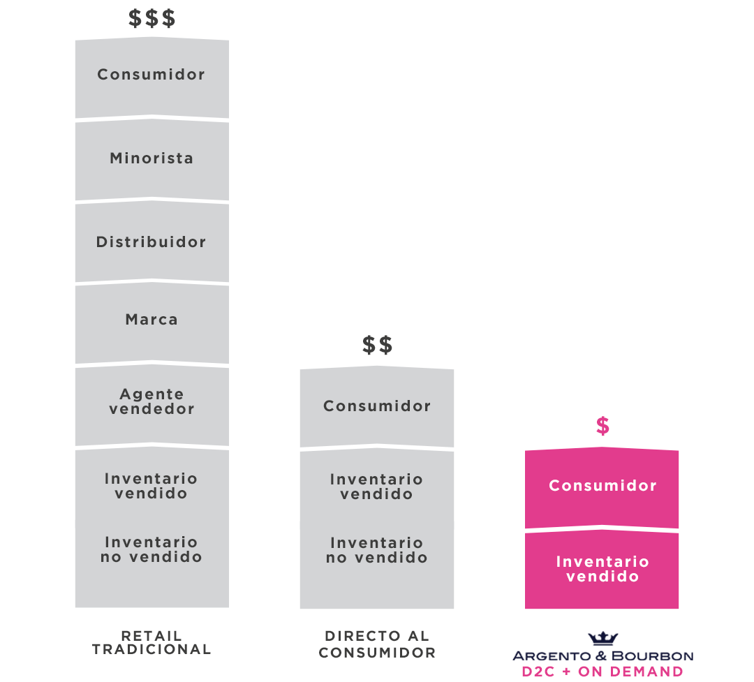 Nos encargamos de cada etapa de la producción, incluyendo el diseño y el control de calidad. Así, nos diferenciamos de los modelos tradicionales de retail al producir bajo demanda, evitando intermediarios costosos y los gastos generales del retail. De esta manera, los ahorros se transfieren directamente a ti.