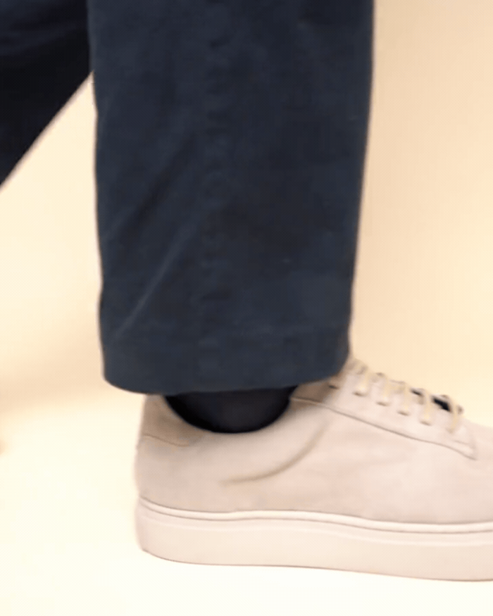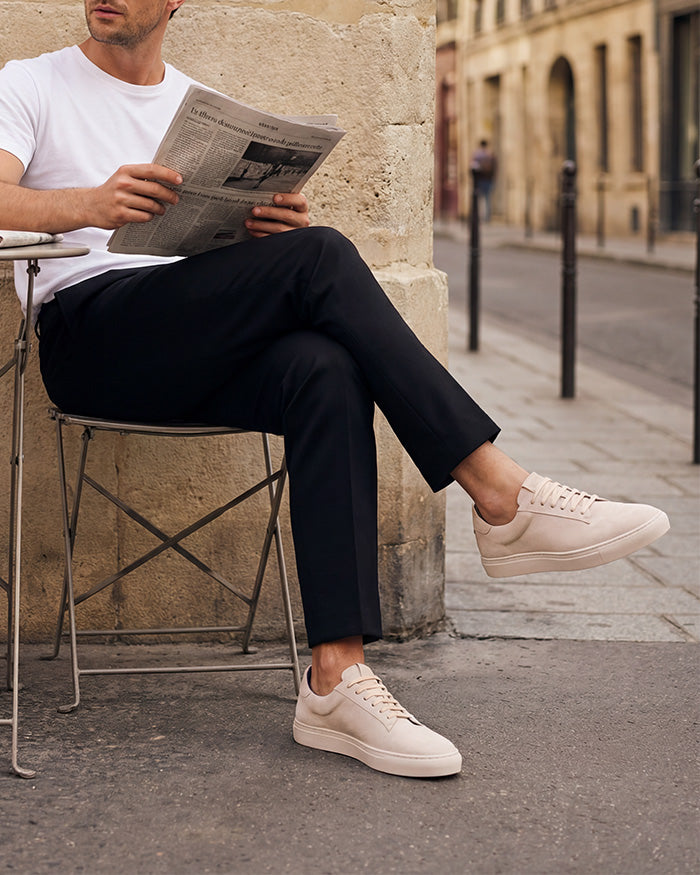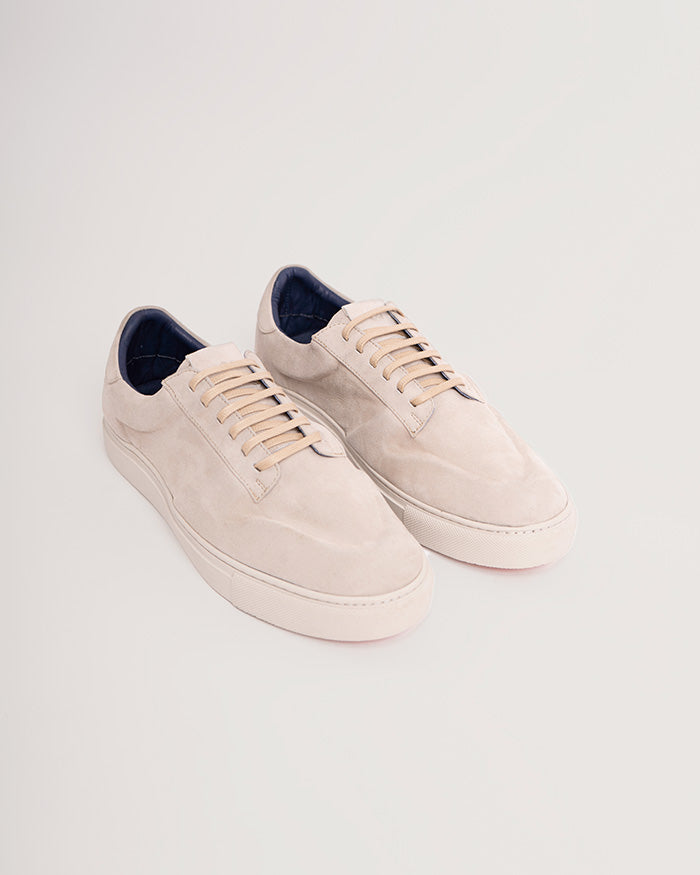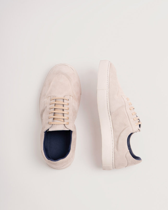 Una silueta urbana llevada a su versión más depurada. En gamuza monocromática tono hueso y con construcción abullonada, equilibra comodidad y carácter con naturalidad.